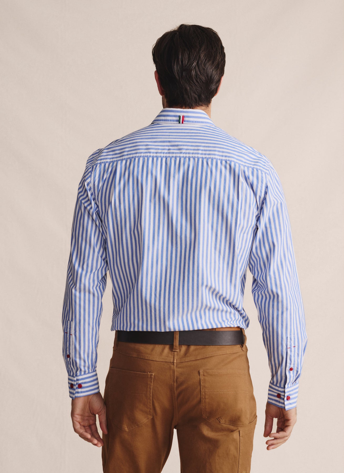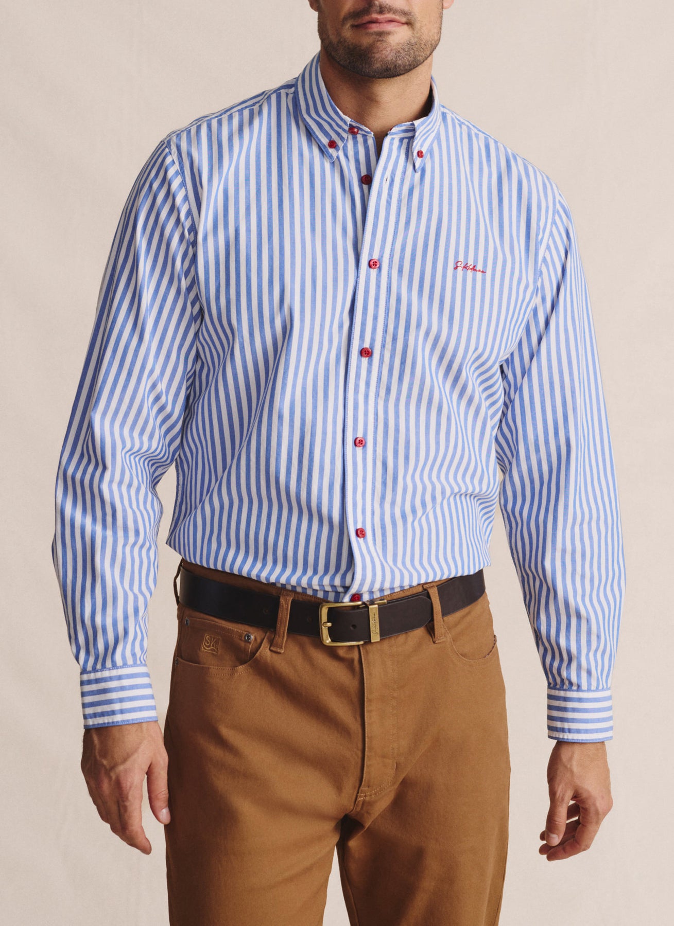 Small scale yarn dyed check, countryman pockets with pen holder, long shirt tail, back pleat for comfort and movement, concealed collar peak buttons, removable collar stays, horseman embroidery on chest pocket